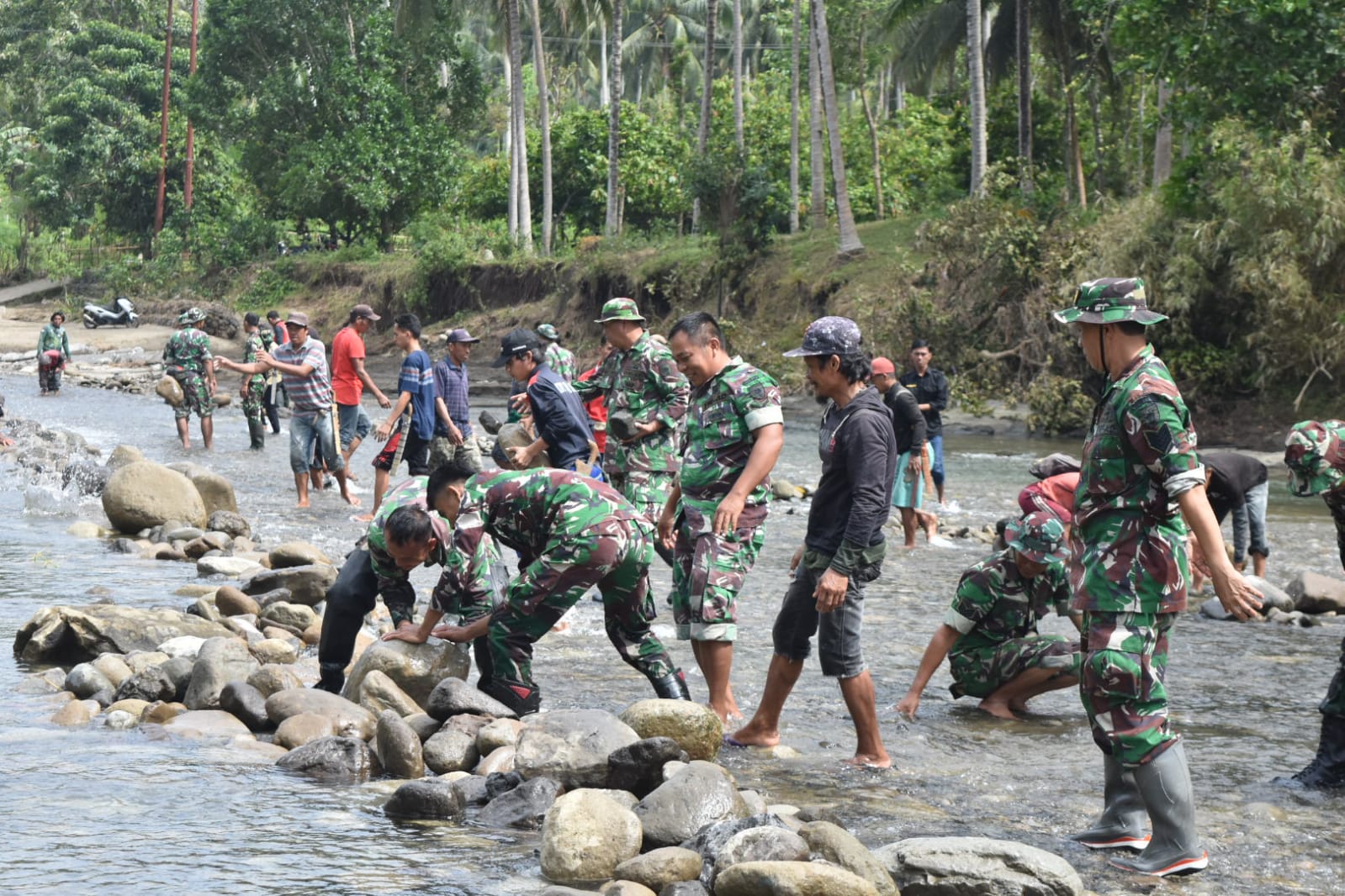 Polewali, Mandar, Komunika Nusantara. Puluhan anggota TNI dari Kodim 1402/Polman bersama Anggota Polisi dan Masyarakat melakukan Karya Bakti perintisan jalan penyeberangan melintasi sungai di Desa, Kalumammang, Kecamatan Alu, Kabupaten Polewali Mandar, Senin (31/10/2022)