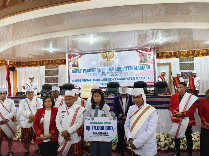 Penyerahan santunan ini menjadi bagian dari rangkaian peringatan Hari Jadi ke-23 Kabupaten Mamasa, yang juga dihadiri oleh pimpinan dan anggota DPRD, jajaran pemerintah daerah, serta perwakilan BPJS Ketenagakerjaan.