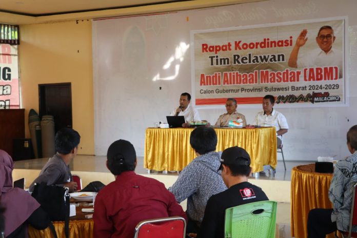 Polman, Komunika Nusantara_ Kembali bertarung di Pemilihan Gubernur Sulawesi Barat (Sulbar) Ali Baal Masdar (ABM) rapat koordinasi pematangan tim relawan di Baruga Tolilaing Matakali,Kecamatan Matakali, Jumat (14/6/2024).