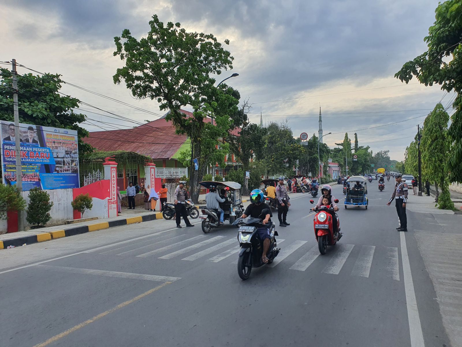 Petugas Sat Lantas terlihat sigap mengatur kendaraan, membantu para siswa menyeberang jalan, serta memberikan imbauan kepada pengendara untuk mematuhi rambu lalu lintas.