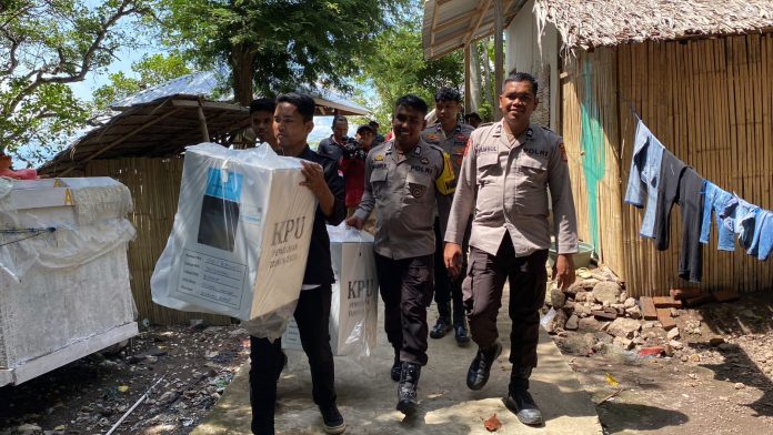 Personel Polres Polman bersama petugas KPU setempat terlihat bahu-membahu memastikan kotak suara tiba di lokasi dengan aman. Perjalanan laut yang ditempuh memerlukan koordinasi ketat untuk menjaga stabilitas logistik selama pengangkutan.