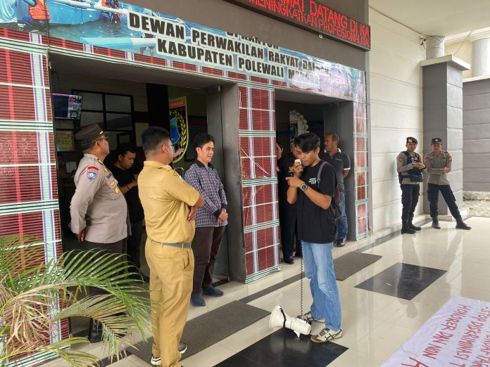 POLMAN — Polres Polman melaksanakan pengamanan terhadap aksi unjuk rasa (UNRAS) yang digelar oleh Himpunan Mahasiswa Islam (HMI) di Kantor DPRD kabupaten Polman Senin (14/10/24).