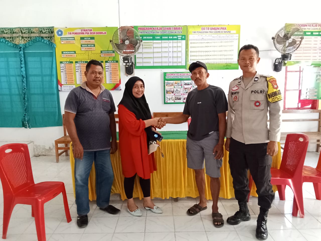 POLMAN — Bhabinkamtibmas desa Sidorejo Aiptu Suranto bersama Kepala Desa Sidorejo Nurdin melaksanakan giat problem solving permasalahan limbah kotoran ternak (sapi), di aula kantor Desa Sidorejo Kecamatan Wonomulyo Kabupaten Polman. Selasa (22/10/24)